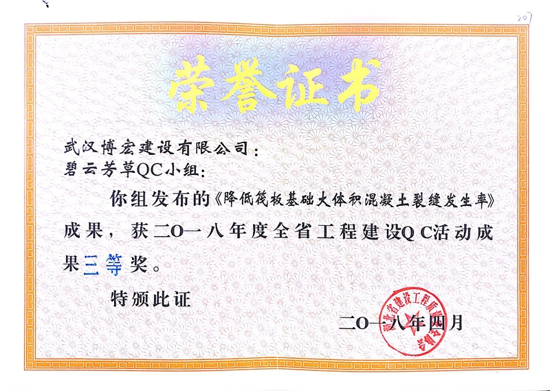 2018年度省建設(shè)QC活動(dòng)成果三等獎(jiǎng)(碧云芳草小組)