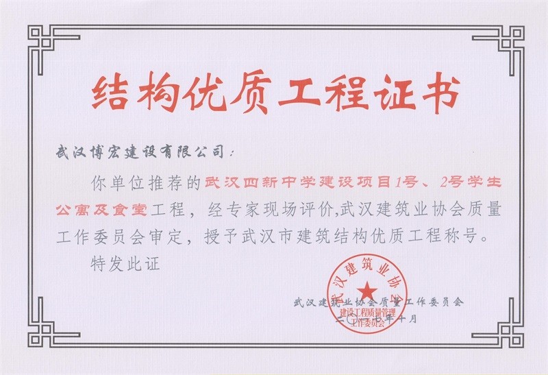 結(jié)構(gòu)優(yōu)質(zhì)工程證書(shū)(武漢四新中學(xué)綜合1號(hào)、2號(hào)學(xué)生公寓及食堂樓)