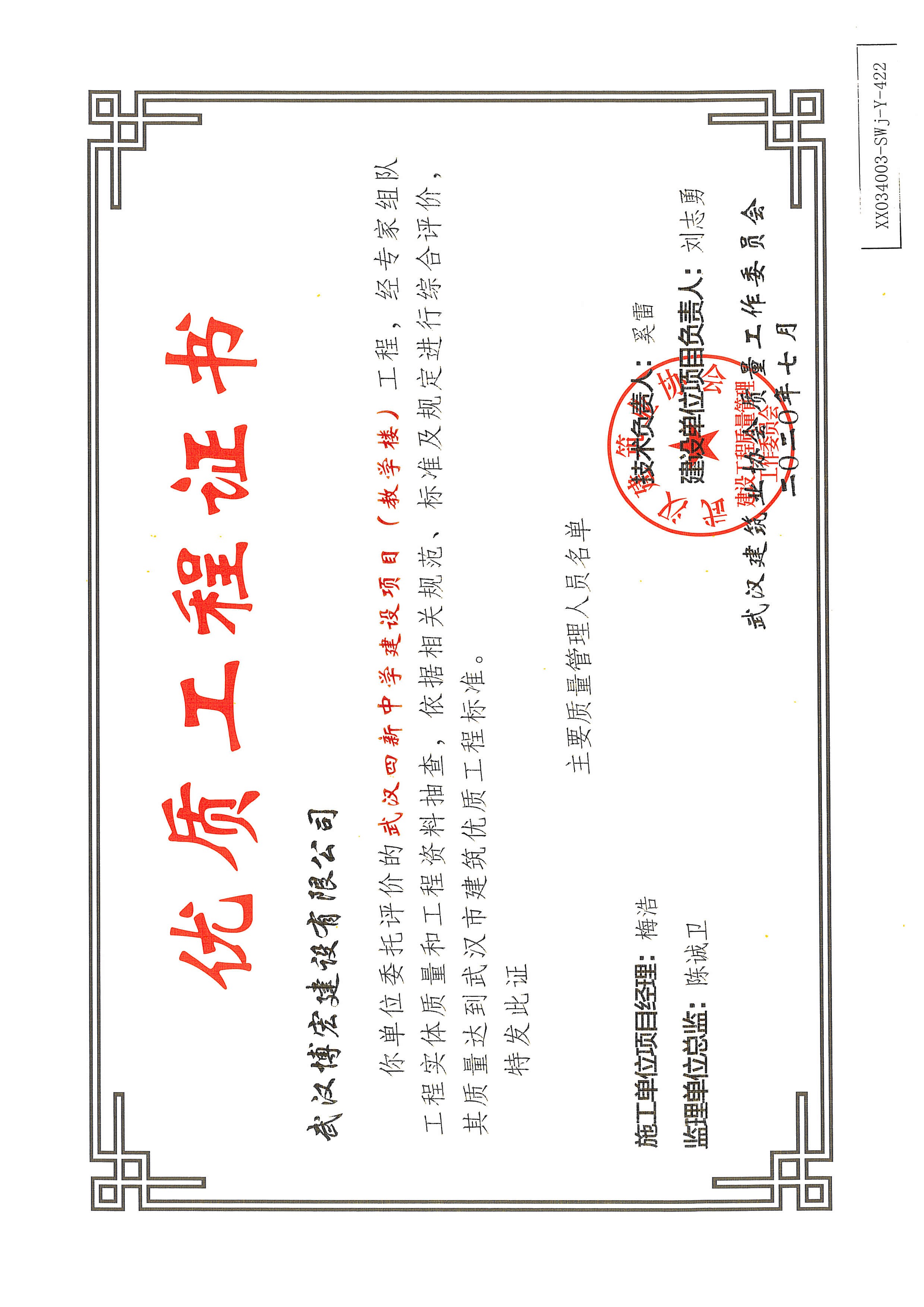 優(yōu)質(zhì)工程證書(武漢四新中學(xué)建設(shè)項(xiàng)目工程(綜合教學(xué)1--4號樓)