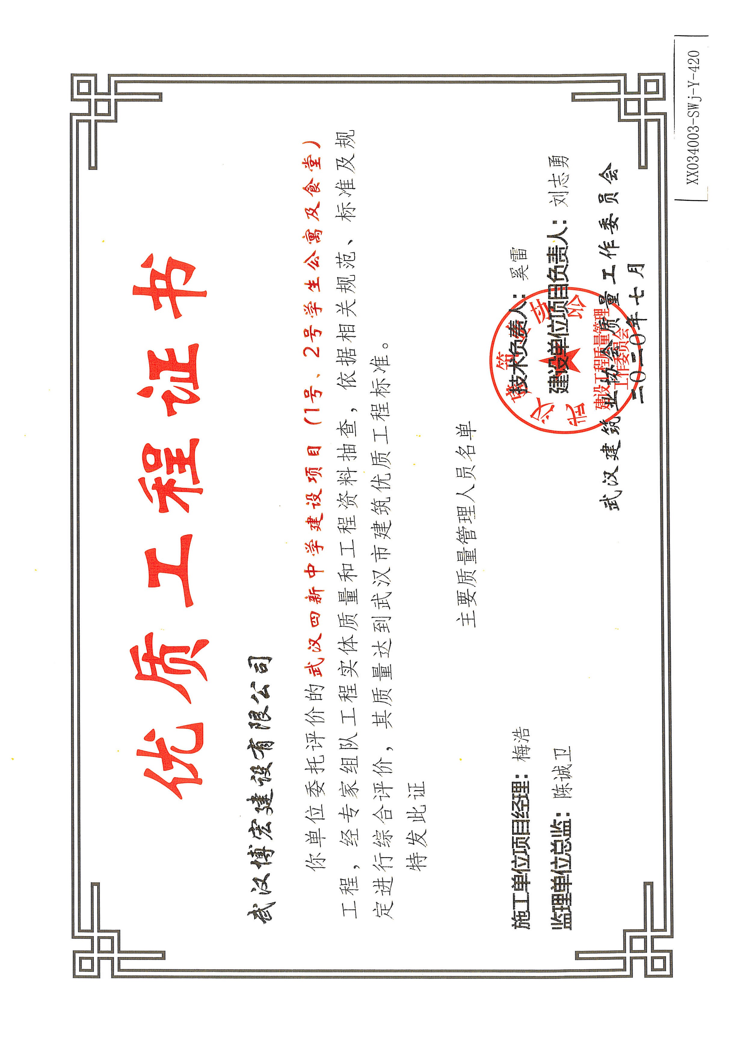 優(yōu)質(zhì)工程證書(武漢四新中學(xué)建設(shè)項(xiàng)目工程(1、2號學(xué)生公寓及食堂)