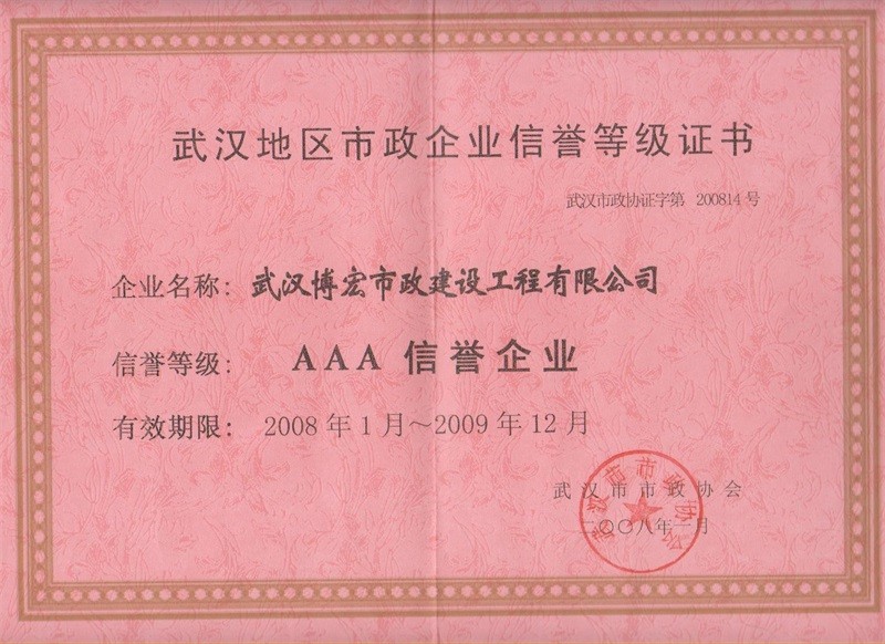 2008-2009年度武漢地區(qū)市政企業(yè)信譽等級證書(AAA信譽企業(yè))