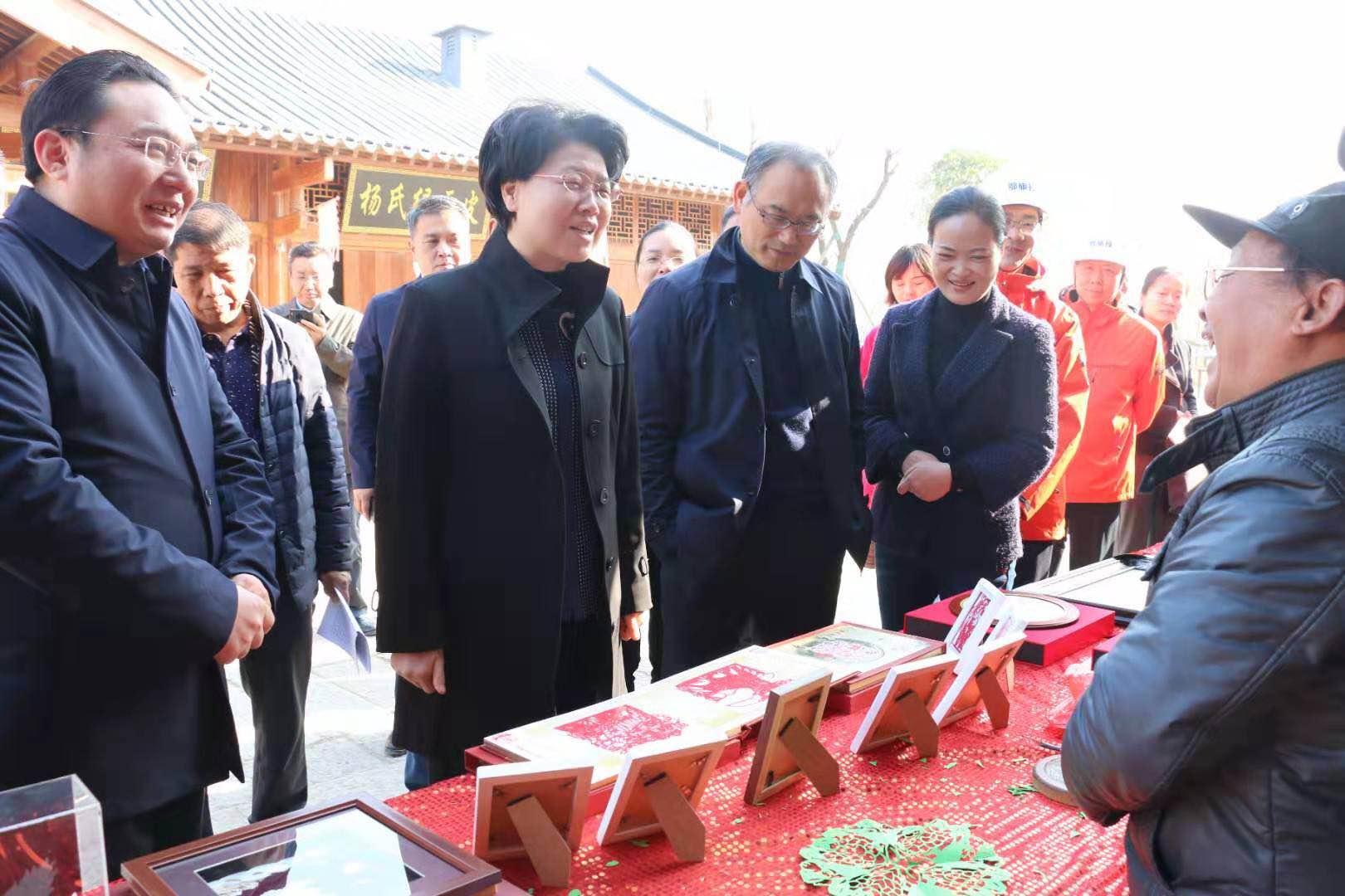 肖菊華一行走進(jìn)項(xiàng)目現(xiàn)場,在項(xiàng)目負(fù)責(zé)人的陪同和講解下,參觀了沔陽小鎮(zhèn)迎客廳、商業(yè)街、云野夢田服務(wù)中心及樣板間等區(qū)域,并觀賞了沔陽傳統(tǒng)花鼓戲《站花墻》選段,欣賞了沔陽非物質(zhì)文化遺產(chǎn)代表作雕花剪紙、沔陽貝雕、麥稈畫等。肖菊華在考察項(xiàng)目建設(shè)情況的過程中,親切地同文化傳承老藝人進(jìn)行了交流,一方面肯定了老藝人們對沔陽文化的堅(jiān)守,另一方面對項(xiàng)目整體設(shè)計和構(gòu)造所呈現(xiàn)出來的獨(dú)特文化展示平臺表示了認(rèn)可。