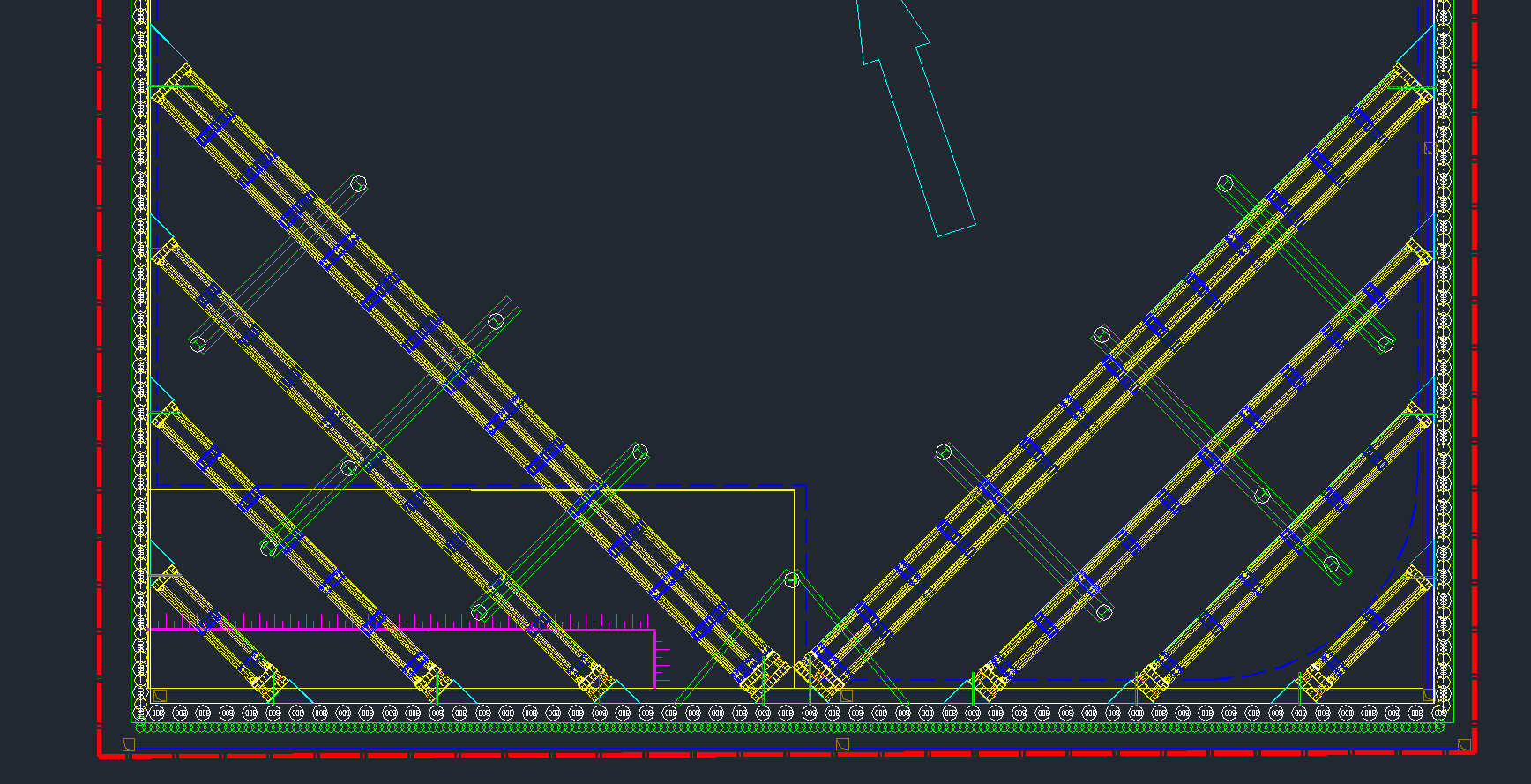 基坑南北兩側(cè)采用型鋼角撐,每一側(cè)角撐由四道型鋼斜撐組成,與冠梁形成45°角,由內(nèi)向外有雙拼型鋼和三拼型鋼兩種。型鋼采用HHC400ZC,長(zhǎng)度根據(jù)標(biāo)準(zhǔn)件長(zhǎng)度調(diào)整100A~12000A??缍容^大型鋼支撐設(shè)型鋼立柱,采用H488型鋼立柱。