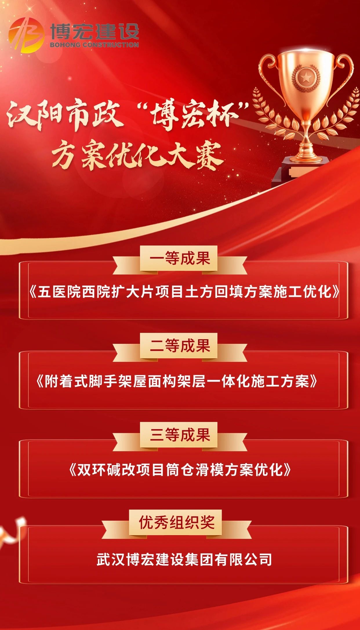 12月24日下午,漢陽市政“博宏杯”方案優(yōu)化大賽在漢陽市政建設大廈205會議室順利舉行,本次比賽以“技術賦能項目生產”為主題,經過現(xiàn)場匯報評選,博宏建設集團斬獲1項一等成果,1項二等成果,1項三等成果,與此同時,公司獲評優(yōu)秀組織單位。